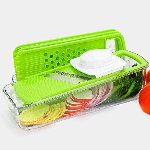 Den smarta maskinen som du letat efter. Med denna grönssaksslicer gör du dina egna favoritsallader på några ögonblick. Den fungerar perfekt för att strimla sallad, potatisgratängen, Janssons Frestelse, hacka lök eller skiva grönsaker och få allt uppsamlat i lådan på 1500ml. Du får alltid professionellt resultat Varför inte tärna potatis till din egna pyttipanna. Gör Tacos på ett ögonblick. Slipp tårarna när du hackar lök. Det medföljer 4 laserslipade skärblad som gör stavar, tärningar, skivor och tärningar i olika storlekar samt ett skärblad för fyra eller åtta klyftor. Anpassade till potatis, ägg, äpplen mm. Ergonomisk rotfruktsskalare ingår också. Trendig och funktionell grönssaksslicer. Med slicern får du alltid snabba och önskvärda resultat. Den skär dina grönsaker i jämna fina skivor, exakt i den storlek du vill ha dem. För rengöring kan slicern smidigt plockas isär. Grönsaksstrimlare / Grönsakshackare / Grönsaksmaskin / Skivningsmaskin för grönsaker och frukter.