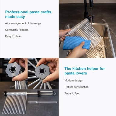 Med vår pastahylla har du den perfekta kökshjälpen till hands. De 14 stängerna erbjuder tillräckligt med utrymme för din pasta. Njut av hemlagade nudlar och förtrolla dina nära och kära.