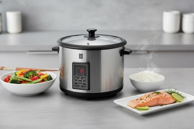 F&B riskokare 73129 har LED-display, härdat glaslock och greppvänliga handtag. Den kokar, ångar, sauterar och håller mat varm i 12h. Non-stick innerskål är lätt att rengöra. Inkluderar sked, mätkopp, ånginsats.'Läs mer om produkten