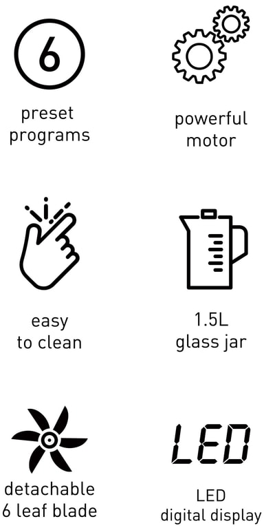 Mixern erbjuder 6 mångsidiga funktioner som styrs via ett intuitivt pekgränssnitt, vilket gör det enkelt för användaren att växla mellan olika uppgifter som mixning, blandning och iskrossning.