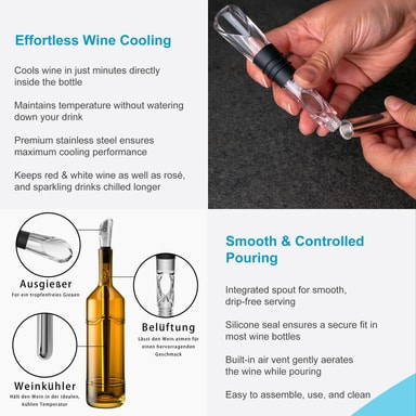Munstycket har en integrerad luftningsfunktion som gör att vinet kan andas ordentligt, vilket optimerar smakupplevelsen. Samtidigt kan kylbarriären kyla ner vinet utan att späda ut det, så att det alltid har den perfekta temperaturen.