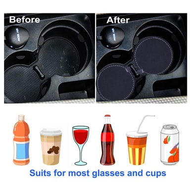 Underlägg tillverkade av PVC-läder med snygga sömmar runtom, varken bleknar eller spricker. Absorberar vatten utanför muggen, håller bilens mugghållare ren. Passar de flesta bilar.
