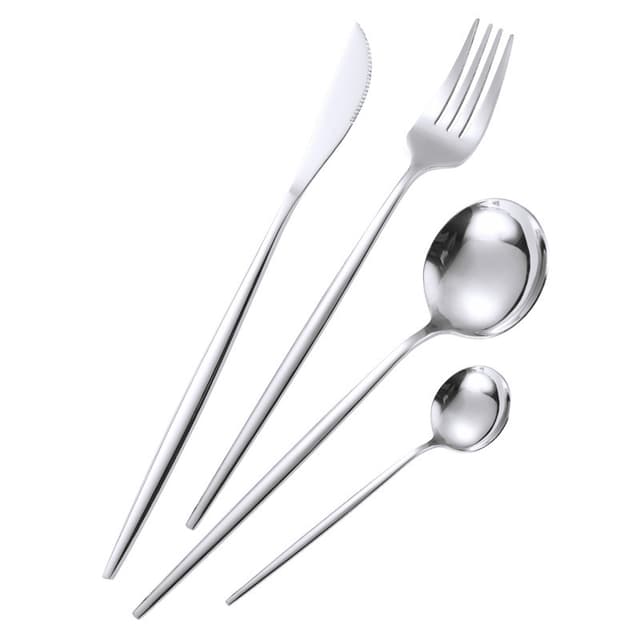 Bestickset av högkvalitativt rostfritt stål, som är hållbart och rostbeständigt. Den välpolerade ytan ger besticken en elegant look. Satsen består av gaffel, kniv, matsked och tesked.