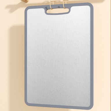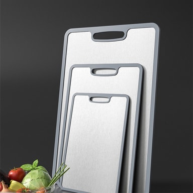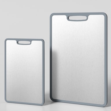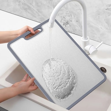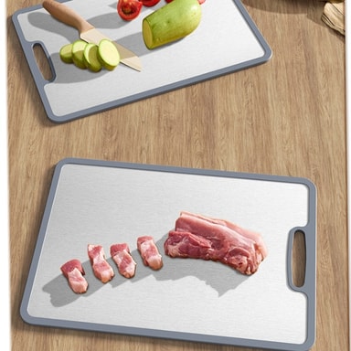 Dubbelsidig mångsidighet: Denna dubbelsidiga skärbräda erbjuder mångsidighet för olika matlagningsuppgifter. Använd ena sidan för rått kött och den andra för grönsaker eller tillagad mat för att förhindra korskontaminering. Den släta ytan i rostfritt stål är skonsam mot knivar och hjälper till att bibehålla deras skärpa över tid. Denna design maximerar brädans funktionalitet och förlänger dess livslängd, vilket gör den till ett praktiskt och effektivt tillskott till alla kök. Njut av bekvämligheten med att ha två distinkta ytor för olika typer av mat, vilket säkerställer optimal hygien och organisation.