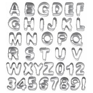 Utstickarset i rostfritt stål. Alfabet och siffror. 37 stk. Storlek: 1,9 cm. 1. Rulla ut marsipanen eller fondanten. 2. Pressa ner utstickaren och lyft upp formen med en liten spatel.