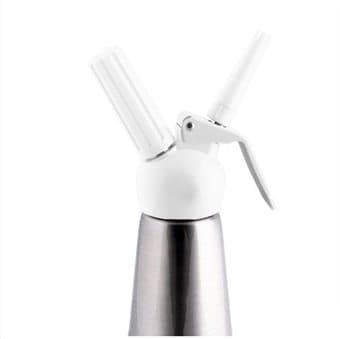 Gräddsifon 0,5 liter Silver/vit Behållare i polerad aluminium med vitt huvud i plast. Gör grädde snabbt och enkelt utan att vispa! Du bara fyller den med vanlig ovispad grädde och därefter sköter patronen resten. För när man trycker ut grädden så kommer den drivas ut av gasen i patronen och därmed bli lika luftig som vispad vispgrädde. Väldigt smidigt om man har ont om tid exempelvis. Glöm inte köpa patroner, de finns här Volym: 0,5 liter Mått: Höjd inkl spritsmunstycke: ca 33 cm Höjd utan spritsmunstycke: ca 28 cm Bredd: 8 cm