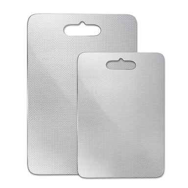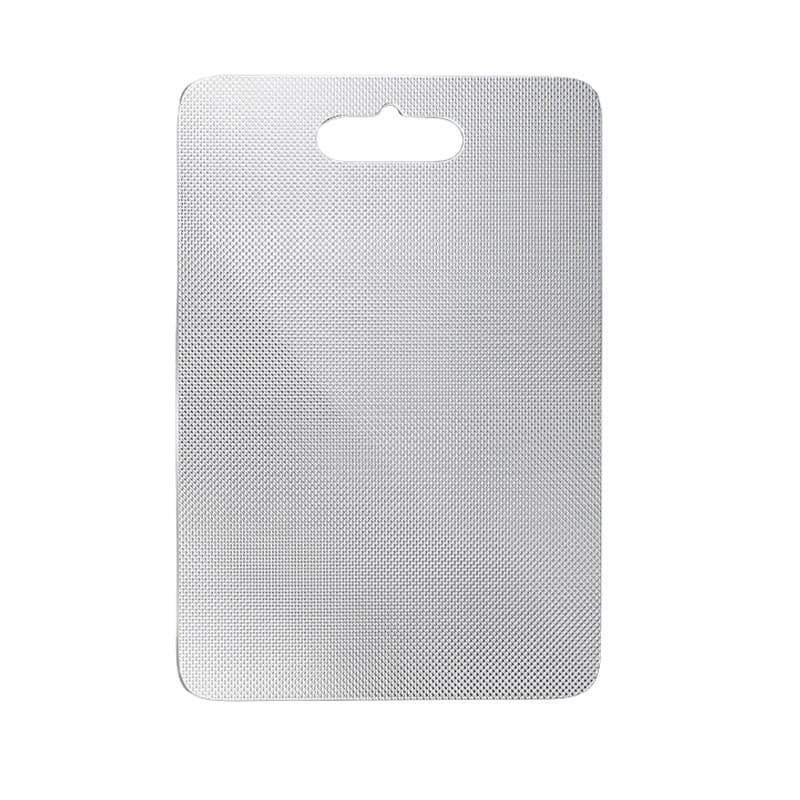 Reptålig yta: Den risgrynstexturerade ytan på denna skärbräda i 304 rostfritt stål ger exceptionell reptålighet och bibehåller sitt eleganta utseende även vid frekvent användning. Denna funktion säkerställer att brädan förblir hygienisk och lätt att rengöra, vilket förhindrar ansamling av bakterier och matpartiklar i repor. Den unika texturen ger också ett lätt grepp, vilket förhindrar att mat glider under skärning, vilket gör det säkrare och effektivare för alla dina matlagningsbehov. Perfekt för att hacka grönsaker, skiva kött eller förbereda deg, denna skärbräda är ett mångsidigt tillskott till alla kök.