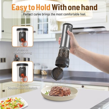 【Batteriindikator】LED-indikator på toppen visar batterinivån. Har en stor kryddbehållare på 100 ml med en ergonomisk böjd design för bekvämt grepp och enkel påfyllning.