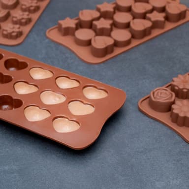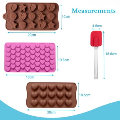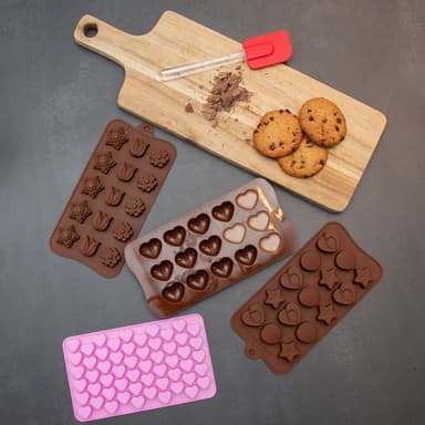 Leveransomfattning: 8x brun bakform, 1x rosa hjärtformar, 1x röd spatel.