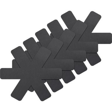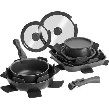 De avtagbara handtagen av värmebeständig bakelitplast är ytterligare en höjdpunkt. Du kan fästa dem på valfri kastrull eller panna vilket garanterar dig flexibel användning och framför allt en enorm platsbesparing, både vid förvaring i skåp eller lådor och i diskmaskinen. För att skydda non-stick-beläggningarna från repor och skador ingår även 5 filtskydd som enkelt kan placeras mellan stekpannorna vid stapling.