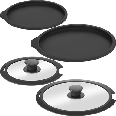 De två glaslocken imponerar med en smart design, eftersom de tack vare ångutsläppshålet effektivt förhindrar bildandet av övertryck vid matlagning. De två silikonöverdragen som ingår i leveransen är dessutom perfekta för att efter matlagningen ställa in den kvarvarande maten direkt i kastrullen eller pannan för kylning.