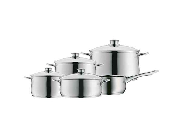 Grytset från wmf som är lämpligy för induktion och som tål diskmaskin. Perfekt till vardagen när man vill att matlagningen ska gå snabbt och enkelt. * kastrullset av hög kvalité från tyska wmf * komplett set med kokkärl i olika storlekar * elegant design som passar både till vardag och fest diadem plus är ett gediget grytset med en snygg rundad form tillverkat i cromargan. Grytorna har ett glaslock av värmetåligt glas vilken ger dig full översikt över det som tillagas. Tillverkat i cromangan 18/10 rostfritt stål med trans therm universalbotten som fungerar på samtliga spistyper. Innehåll: 1 låg gryta ø 16 cm volym 1,5 liter 1 låg gryta ø 20 cm volym 3 liter 1 hög gryta ø 16 cm volym 2 liter 1 hög gryta ø 20 cm volym 3,5 liter 1 hög gryta ø 24 cm volym 6 liter ett glaslock med stålkant och ett rejält värmeisolerat medföljer handtag till alla grytor. Material: 18/10 rostfritt stål