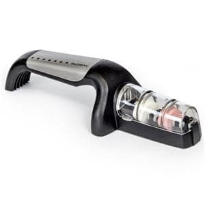 Den nya G-91 från Global är det ultimata verktyget för att skärpa dina globala knivar. Med bra design och användarvänlighet Detta är lätt att använda och tar upp lite utrymme i köksskåp. Hur man använder du det: Fyll kammaren med vatten. Det rensar stenarna och förhindrar metallen i uppvärmning. Dra knivbladet vertikalt fram och tillbaka genom den vita stenen 7-8 gånger. Upprepa i den rosa stenen, och tvätta sedan kniven för hand. Sedan har du gjort en ny och skarp ägg på din kniv och det är klart att användas.