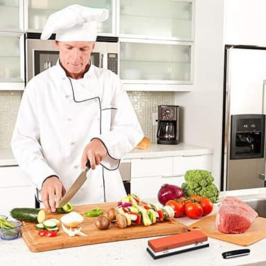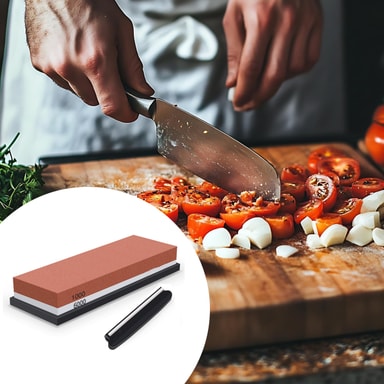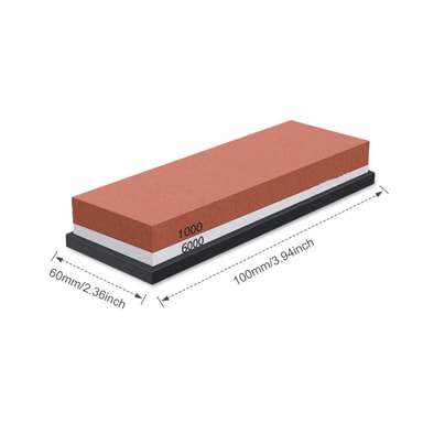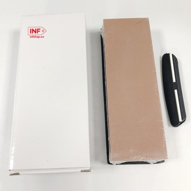 Komplett våtslipstenssats med brynsten, hållare och slipstöd. Slipstenen har två sidor med olika kornstorlek, en för att göra skåran och glitchen plattare, den andra för att göra kanterna vassare. Hållaren i silikon håller brynet fixerat under knivslipningen.