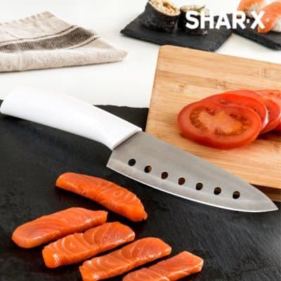 Upptäck det nya sättet att skära enklare och tryggare med denna japanska kniv med hål Samurai Blade! Shar·X är inspirerad av knivar som används av japanska kockar. Skärbladet med sju hål reducerar friktionen när man skär, vilket gör arbetet enklare och säkrare.