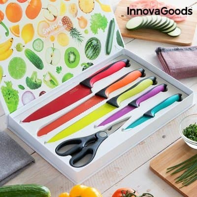 har du inte set med keramiska knivar och saxar swiss-q fashion innovagoods (6 delar) i ditt kök ännu? vänta inte längre och skaffa detta kompletta och exklusiva set med saxar och fem högkvalitativa knivar i färggranna färger presenterade i en praktisk ask. De vassa bladen gör det enkelt och säkert att göra exakta skärningar. Det perfekta komplimentet till professionella kök eller hemma!