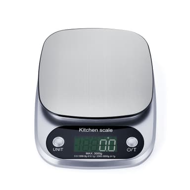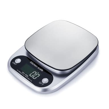 Elegant och lätt att rengöra: Köksvågen har en stilren design med en yta i rostfritt stål som är både snygg och praktisk. Den är lätt att rengöra och motstår fläckar och fingeravtryck, vilket gör den idealisk för användning i köket. Den kompakta designen gör att den tar minimalt med plats i skåpet eller på köksbänken när den inte används. Den silverfärgade finishen passar in i de flesta köksinredningar och ger ett modernt intryck.