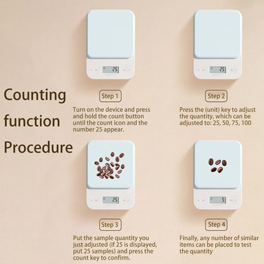 Räknefunktion: Den integrerade räknefunktionen låter dig räkna små föremål som kaffebönor, piller eller smyckeskomponenter. Denna funktion är ovärderlig för portionskontroll, lagerhantering och olika hantverksprojekt. Vågens intuitiva gränssnitt gör det enkelt att växla mellan vägnings- och räknelägen, vilket ger mångsidighet för en mängd olika uppgifter. Effektivisera dina processer och säkerställ noggrannhet med denna innovativa och praktiska funktion, perfekt för både hem- och professionellt bruk.