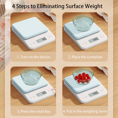 Flera enheter & Tara: Med nio olika enhetsomvandlingar, inklusive gram, uns, pund och milliliter, tillgodoser denna våg ett brett utbud av recept och kostbehov. Den praktiska tarafunktionen låter dig subtrahera vikten av behållare och ger nettovikten av dina ingredienser. Denna funktion är särskilt användbar när du använder skålar eller tallrikar för att hålla föremål som mäts. Förenkla din matlagningsprocess och uppnå exakta mätningar med lätthet, oavsett receptets ursprung eller mätsystem.