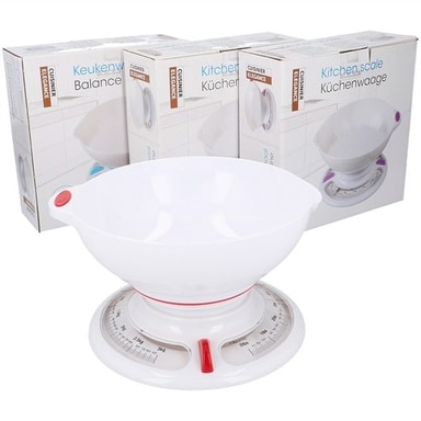 Analog köksvåg med avtagbar skål tack vare sin stabila, gummierade botten står skålen stadigt med gram- och pundskala max 3kg