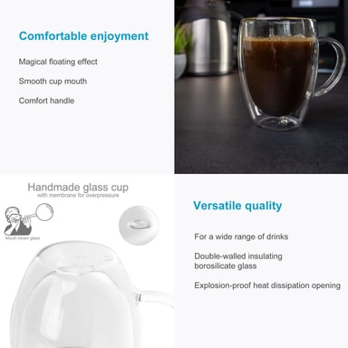Det förhindrar att varma drycker svalnar snabbt utan att utsidan värms upp och bränner fingrarna. Tack vare den dubbla väggen lämnar glasen ingen vattenring efter sig när du dricker kalla drycker!