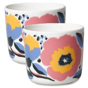 Set med två kaffekoppar utan handtag. Rosariummönstret som pryder kopparna visar en rosenträdgård med olika varianter av rosor men Vresrosen är den mest dominerande i designen. Aino-Maija Metsola som designat mönstret hade Vretrosen växandes utanför sitt hem och därav inspirationen till mönstret. Kopparna går att diska i diskmaskin, värma i microvågsugn, förvara i frysen samt är ugnsfast.