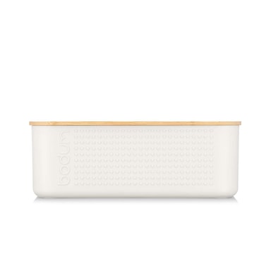 Tämä suuri leipälaatikko tarjoaa näyttävää säilytystilaa keittiötasollesi. Se on tehty värikkäästä BPA-vapaasta muovista, ja siinä on mukana bambukansi joka toimii myös leikkuulautana sekä tarjottimena leivällesi, murut talteen keräävien urien kera.