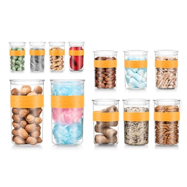 De mångsidiga och flexibla förvaringsburkarna av plast finns i flera olika storlekar för att passa vanliga skafferivaror, vilket gör dem idealiska för flingor, pasta, mjöl, socker, nätter, bönor, kaffe, te och andra matvaror och även perfekta för att förvara olika vätskor. De är utrustade med ett silikonband som ger bekvämt grepp och kompletterar andra artiklar i Bodums sortiment.