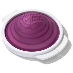 Återanvändbart silikonöverdrag till halverade lök och andra frukter och grönsaker. Silikonöverdraget sluter tätt omkring löken så att den håller sig fräsch längre. Alltså minskar du ditt matspill och användningen av plast- eller aluminiumfolie. Överdragets botten kan användas som en liten skärbräda. Tål maskindisk.