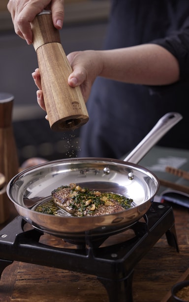 Stekpanna, 24 cm, i polerat rostfritt stål med stålhandtag, 6 mm sandwichbotten och honeycomb-yta. Strukturen på stekytan innebär att fettet lägger sig i fördjupningarna, vilket minskar risken för förbränning. Stekning i stålpannaDet är annorlunda att steka på en panna i rostfritt stål än på en panna med beläggning, och just därför föredrar många professionella kockar stålstekpannor.Lägg i stekfett i pannan och värm upp den på medelhög värme. Fördela stekfettet över pannans hela stekyta och utmed sidorna.Höj temperaturen något, lägg i livsmedlet i pannan och justera värmen till önskad tillagningstemperatur.I början av tillagningen kan det se ut som att maten bränner fast på pannan, men så fort det har bildats en stekskorpa kan maten flyttas runt i pannan och vändas.