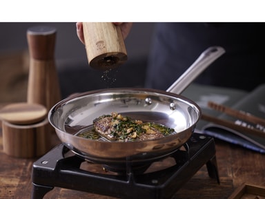 Stekpanna, 24 cm, i polerat rostfritt stål med stålhandtag, 6 mm sandwichbotten och honeycomb-yta. Strukturen på stekytan innebär att fettet lägger sig i fördjupningarna, vilket minskar risken för förbränning.Läs mer om produkten