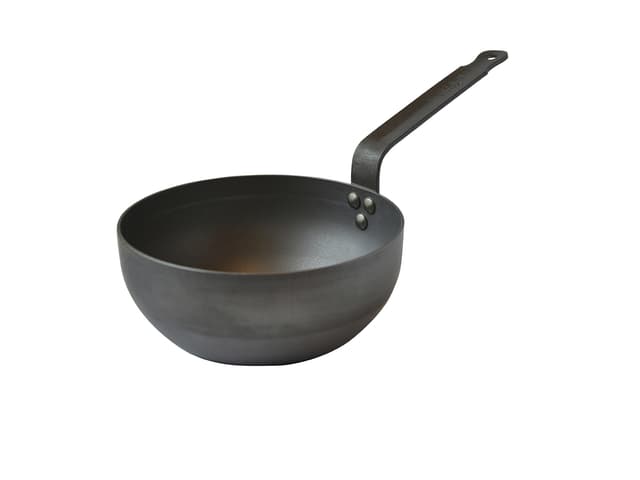 Professionell kvalitet svart stål, som med tiden får en naturlig non-stick-egenskap. Extra tjockt 1,2 till 3 mm svart stål (kolstål). Handtag i stål med stålnitar. Utmärkta värmeledningsegenskaper. Tål höga temperaturer och metallredskap