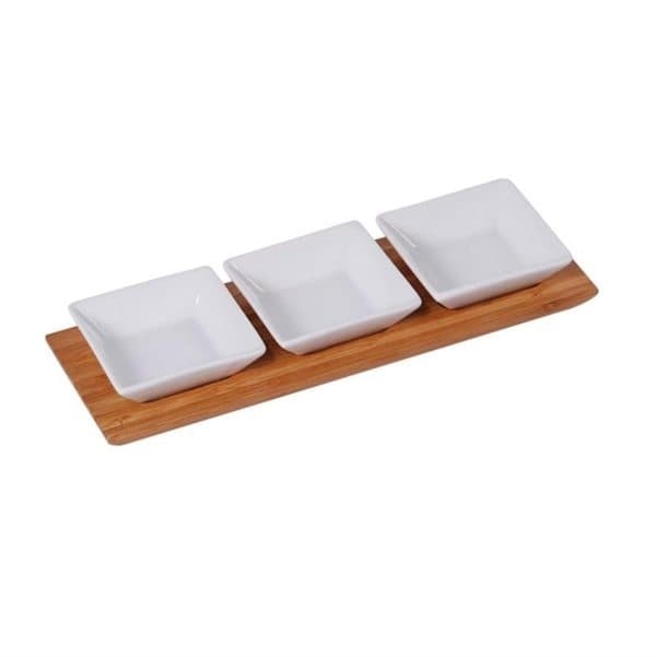 Serveringsfat i 4 delar bambu är det mest naturvänliga träslag att använda, och det är även väldigt slitstarkt och hållbart. Här är bambu använt för skapa en perfekt bricka för 3 snygga skålar! Mått: 28x10x3 cm