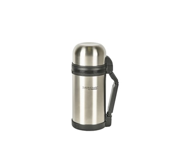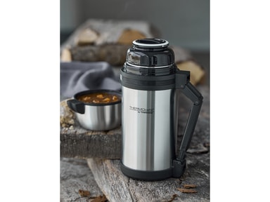 Thermos 1,2 liter termosflaska modell Multipurpose i rostfritt stål med bärrem. Locket kan användas som kopp, eller skål för soppa och liknande, och flaskan lämpar sig för både kalla och varma dryckerLäs mer om produkten