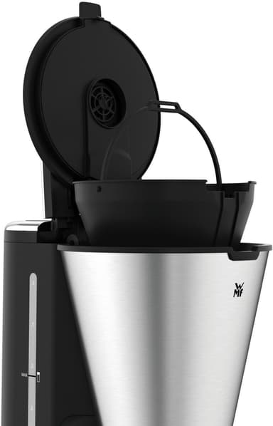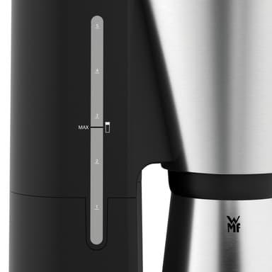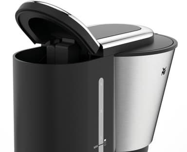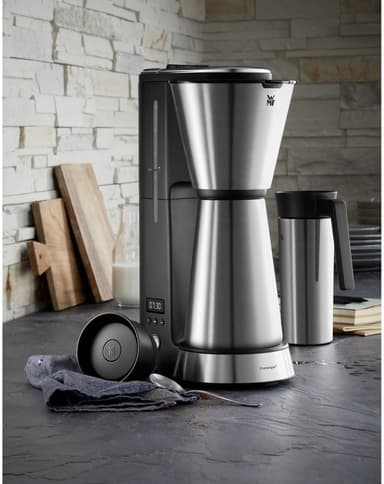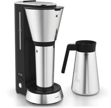 Utrustningsnivån bör inte äventyras även i ett litet kök. Den kompakta och snygga WMF KITCHENminis AROMA Thermo To Go termos kaffebryggare har en 24-timmars timer och du kan bekvämt brygga 1-5 koppar kaffe med den. Tack vare timern är kaffet klart precis när du vill ha det – och du vaknar till doften av färskt kaffe varje morgon. Du kan göra ditt morgonkaffe antingen i en termoskanna eller direkt i en bekväm, läckagesäker take away termosmugg (350 ml). Vattenkokaren är givetvis gjord av högkvalitativt, rostfritt Cromargan-stål. Den perfekta filtreringstemperaturen extraherar de bästa aromerna från kaffepulvret, och tack vare WMF:s Hot Brew-teknologi är kaffedrycken aromatisk från den allra första koppen. När du vill göra starkare, mer aromatiskt kaffe kan du välja funktionen WMF Aroma Perfection. Det rekommenderas att användas speciellt när du filtrerar en mindre mängd. Tack vare det praktiska dropplåset kan du servera kaffe medan du filtrerar. Den automatiska avstängningen av vattenkokaren sparar energi och ökar driftsäkerheten. Förkalkningsindikatorn talar om när det är dags att avkalka - på så sätt förhindras kalkavlagringar, vilket skulle öka beredningstiden och minska kvaliteten på kaffet. Vattenkokaren har även ett effektivt avkalkningsprogram, vilket förlänger livslängden på vattenkokaren. Enheten har en tydlig LCD-skärm. Den avtagbara filtertratten är lätt att tömma och rengöra. Effekt 760 W. Bredden på WMF KITCHENminis® Aroma To Go termosspis är 20,3 cm, djup 12,6 cm och höjd 32,4 cm. Längden på anslutningskabeln är 1 m. Använd kaffefilterpapper storlek 102.