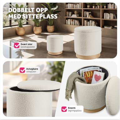 De avtagbara locken är mycket bekväma tack vare skumgummistoppningen och under dem finns generösa förvaringsutrymmen som är idealiska för förvaring av filtar,kuddar eller andra hemtillbehör. Ramarna av robusta MDF-skivor ger en enorm stabilitet och bärförmåga, medan socklarna i trälook ger sittmöblerna både en mysig charm och hög stabilitet.