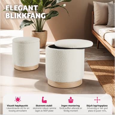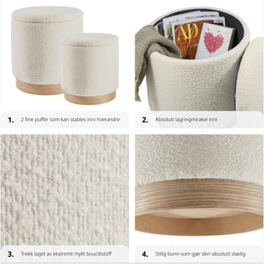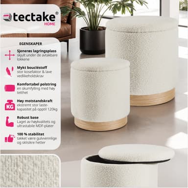 Upptäck 2-set sittpuffar Orchide från tectake och ta med elegans och funktionalitet till ditt hem. Dessa mångsidiga sittpuffar kombinerar enastående design med praktiska egenskaper. Klädda i högkvalitativ bouclé-tyg, erbjuder möblerna en mjuk,kramgo yta som knappt kräver underhåll och ändå ger en elegant touch till ditt hem.
