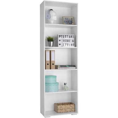 Denna mångsidiga bokhylla med 5 hyllplan erbjuder en stilren och effektiv lösning för förvaring och skapar ordning på ett snyggt sätt. Den väl genomtänkta designen gör att hyllans utrymme utnyttjas maximalt, vilket ger dig flera förvaringsalternativ för böcker, prydnadssaker, lådor eller växter. Bokhyllan är både elegant och stilren, vilket gör den lätt att integrera i alla rum. Med utmärkt stabilitet och en stadig konstruktion av lättskötta MDF-plattor är denna bokhylla ett pålitligt och hållbart val för ditt hem.