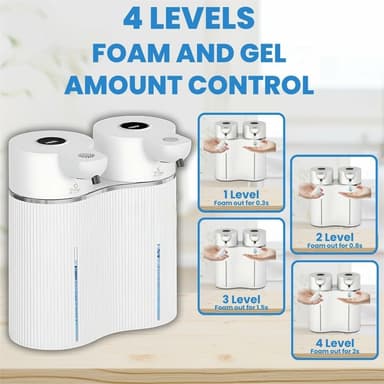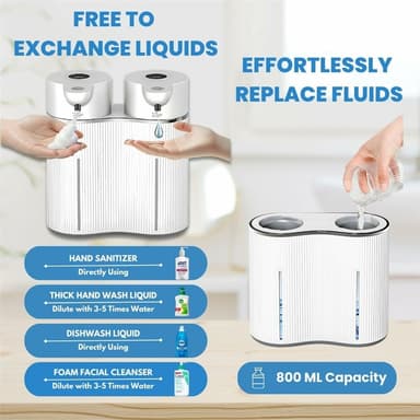 【Design med dubbla huvuden】Har två 400 ml dispensrar för en total kapacitet på 800 ml, vilket möjliggör separat användning av tvål och handsprit eller längre användning utan frekvent påfyllning.
