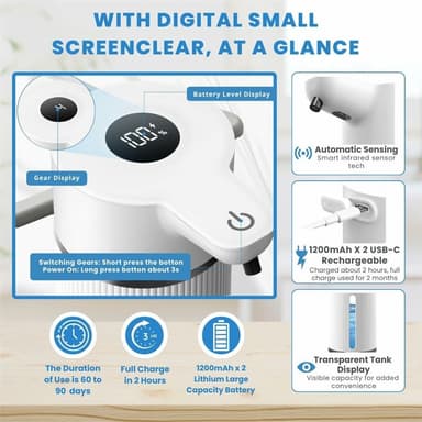 【Batteri med lång livslängd】Varje dispenserhuvud är utrustat med ett 1200 mAh-batteri (totalt 2400 mAh), vilket säkerställer längre användning mellan laddningarna.