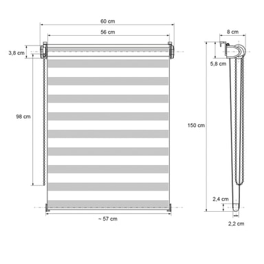 Den ordningsmåttet som anges här är blindens bärare yttre dimension. Tygmåttet är ca 4 cm kortare! (t ex om du väljer ett rullblad på 45 cm, är tygets bredd 41 cm.)