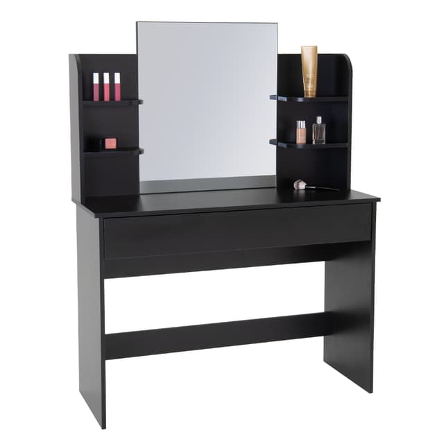 Det moderna sminkbordet från ECD Germany är det perfekta tillskottet till smink och stil. Ytan på det kosmetiska bordet av svart spånskiva är reptåligt och särskilt lätt att sköta. Tack vare sina fack och den integrerade lådan erbjuder den många lagrings- och arkiveringsalternativ. Den stora spegeln ger stor bekvämlighet för vardaglig styling och smink.