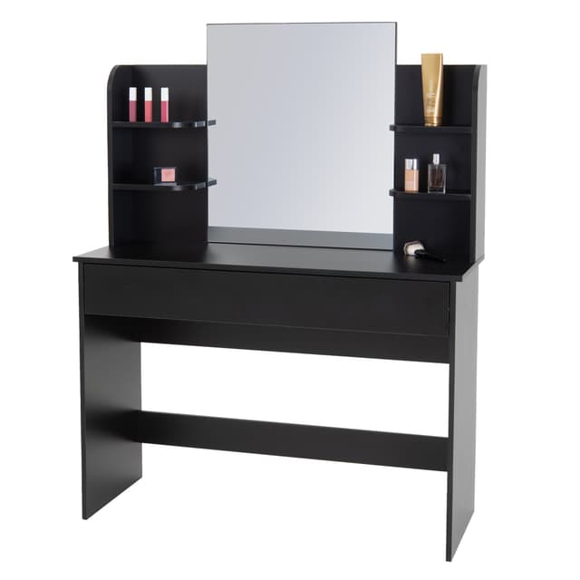 Det moderna sminkbordet från ECD Germany är det perfekta tillskottet till smink och stil. Ytan på det kosmetiska bordet av svart spånskiva är reptåligt och särskilt lätt att sköta. Tack vare sina fack och den integrerade lådan erbjuder den många lagrings- och arkiveringsalternativ. Den stora spegeln ger stor bekvämlighet för vardaglig styling och smink.
