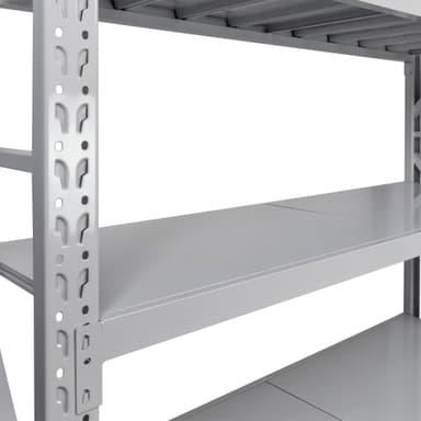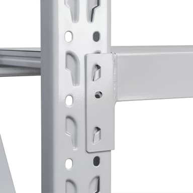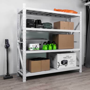 Den här lagerhyllan är perfekt för ett garage, kontor eller lager. Lagerhyllan gör att du kan använda utrymmet mer effektivt genom att flytta föremål från trånga utrymmen till hyllan. Dessutom gör förvaringshyllan också att det blir säkrare att röra sig, eftersom det inte finns några saker som ligger och skräpar i stigarna.