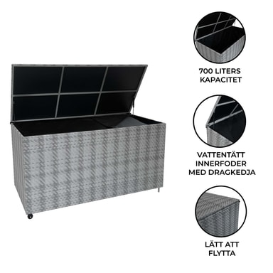 Håll ditt utomhusutrymme enkelt snyggt med denna premium 700L rottingförvaringslåda, designad för både praktisk och stil. Denna förvaringslåda är byggd med hållbarhet i åtanke och har maskinvävd polyrotting, som erbjuder en elegant, högkvalitativ finish som motstår slitage över tid. Den robusta stålramen säkerställer långvarigt stöd, vilket gör den till ett pålitligt val för trädgårdar, uteplatser eller till och med inomhusutrymmen. En UV-beständig exteriör förstärker inte bara dess moderna estetik utan säkerställer också långvarig hållbarhet. Med en generös kapacitet på 700 liter fungerar denna genomtänkta kista som det perfekta ackompanjemanget till våra Jardi Marielle rottingmöbler och ger bekväma höljen för alla kuddar. Alternativt kan den användas som fristående förvaring för trädgårdsredskap och utomhusartiklar. Detta säkerställer deras skydd under de kallare, blötare månaderna samt håller ditt utrymme skräpfritt. Designad för både enkel användning och stabilitet, denna förvaringslåda innehåller genomtänkta detaljer som förbättrar funktionaliteten. De hydrauliska stöttorna säkerställer smidig, kontrollerad locköppning, medan stålhandtaget och de integrerade hjulen gör ompositionering enkel. På motsatt sida ger robusta fötter en säker bas som håller lådan stadigt på plats när den står stilla. Oavsett om du behöver flytta den för bekvämlighets skull eller hålla den fixerad på ett ställe, erbjuder denna välbalanserade design flexibilitet. En utmärkande funktion är det inbyggda vattentäta fodret, som sitter snyggt inuti lådan för att skydda innehållet från regn och fukt. När den är helt dragkedja över toppen skapar den en fullständig försegling som håller allt torrt och skyddat i alla väder. Den UV-beständiga grå polyrattan exteriören förbättrar inte bara dess moderna estetik utan säkerställer också långvarig hållbarhet, förhindrar blekning och skador från solexponering. Med sin blandning av stil, hållbarhet och bekvämlighet är denna 700L Marielle rottingförvaringslåda ett måste för alla utomhus- och inomhusutrymmen. Oavsett om du organiserar din uteplats, gör i ordning din trädgård eller förbättrar din utomhusinredning, erbjuder denna förvaringslösning både elegans och praktisk. Produktegenskaper: * Fantastisk maskinvävd grå rotting * Generös 700L lagringskapacitet * Inbyggt vattentätt foder för skydd * Lätt att bära med 2 hjul och handtag * Gasassisterad locklyftmekanism Specifikationer: * Färg: Grå * Vikt: 21,9 kg * Lådmaterial: Polyrattan * Rammaterial: 8 cm / Steg 0,8m / 31,5" * Bredd: 150cm / 1,5m / 59,1" * Djup: 72cm / 0,72m / 28,3" * Kapacitet: 700L * UV-beständig: Ja Boxens innehåll: * 1 x Säker förvaringsbox