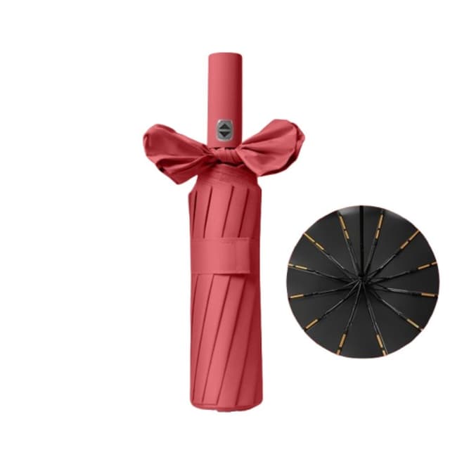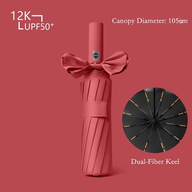 Stark och vindtålig konstruktion: Denna helautomatiska paraply är konstruerad med 24 ribbor (12x2) av en kombination av legering och glasfiber, vilket ger en exceptionell stabilitet och motståndskraft mot starka vindar. Den robusta konstruktionen säkerställer att paraplyet inte vänds ut och in även i de mest utmanande väderförhållandena, vilket ger dig ett pålitligt skydd mot regn och vind.