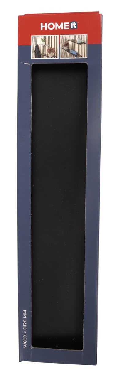 HOME It® hylde, som passer perfekt ind i rillerne på akustikpaneler. Hylden har en forhøjet forkant, så ting på hylden ikke kan falde ned. Hylden er udført i matsort lakeret stål. Hylden leveres inklusive skruer til montering lodret mellem akustikpanelets lameller. Mål: D120×B600 mm