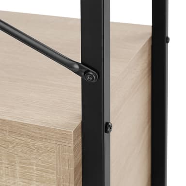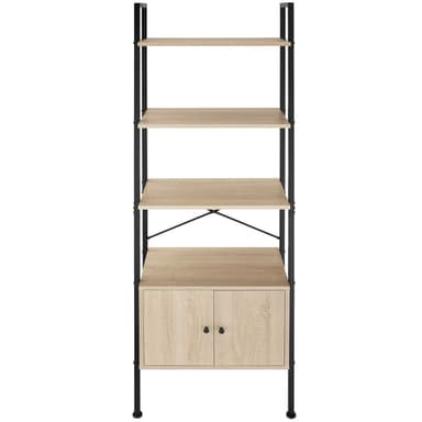 Med sina raka linjer och en minimalistisk design sätter den funktionella hyllan Brentwood från tectake skickligt din dekoration i rampljuset. Den industriella stilen kombinerar svalt stål och varmt trä, vilket ger bokhyllan balanserade konstraster och ett stiligt utseende. På ett platsbesparande sätt erbjuder den lättskötta förvaringshyllan, med fyra öppna hyllplan och två skåp, gott om plats för presentation och förvaring. Hyllans robusta ram och justerbara fötter ger hög stabilitet och ett säkert fotfäste, medan den solida spånskivan erbjuder hållbarhet och styrka. Denna lättskötta och stiliga hylla är både praktisk och smakfull - den perfekta lösningen för ditt hem.