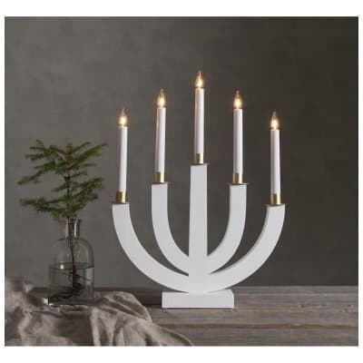 En tidsenlig, inbjudande elljusstake med fem stycken armar av trä, i klassisk vit kulör och inslag av metall i guldkulör.