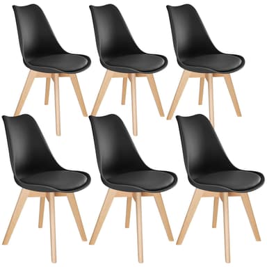 Ett elegant utseende och en diskret färgsättning kännetecknar dessa matstolar från tectake. I den böjda formen av sitsen med sin bekväma stoppning visar sig den höga komforten hos dessa moderna möbler i skandinavisk stil. Benen av massivt trä säkerställer hög stabilitet och belastningskapacitet. Smuts kan enkelt rengöras med en fuktig trasa så att du kan lägga din tid på att njuta av de charmiga matstolarna från tectake.